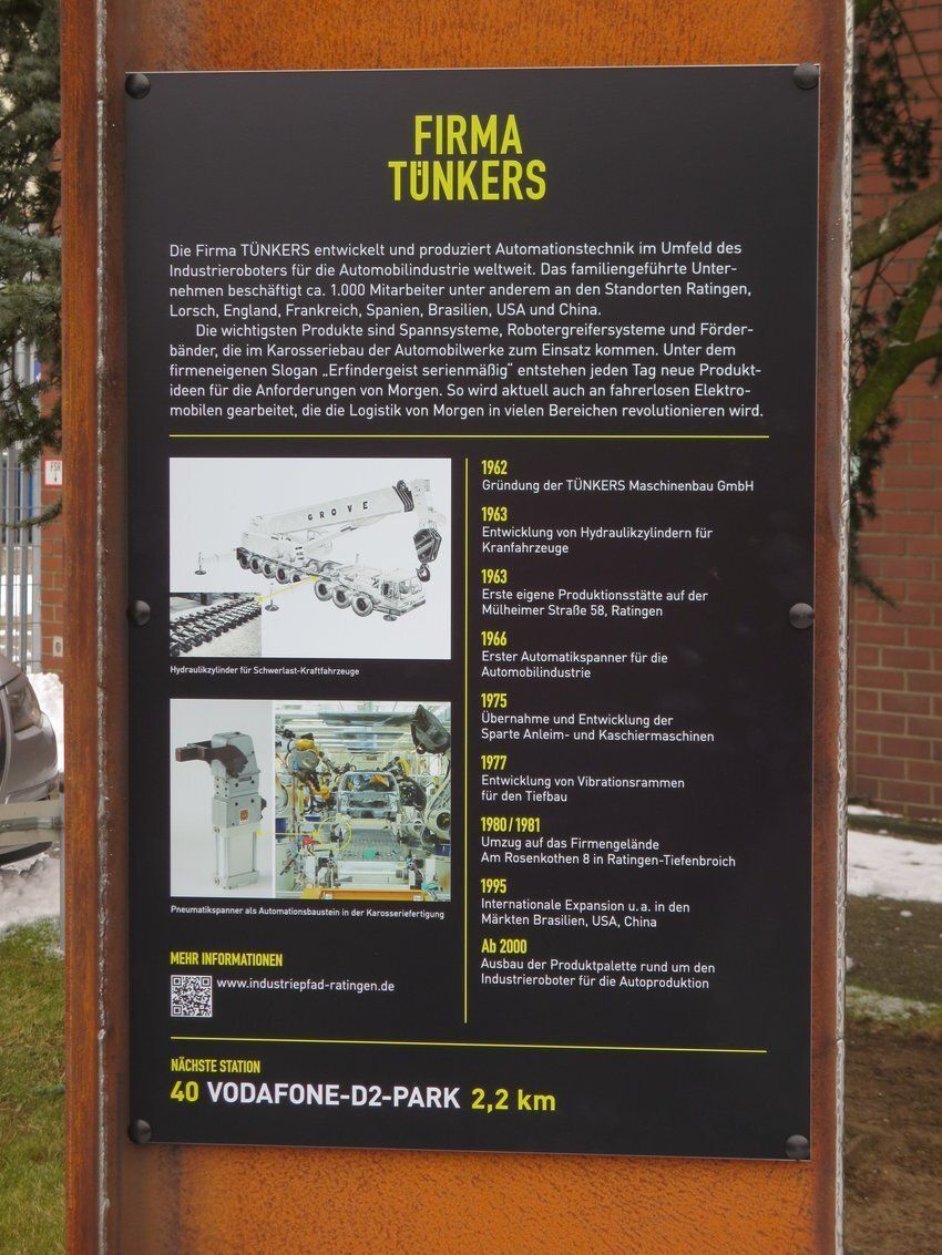 Die Firma TÜNKERS entwickelt und produziert Automatisierungstechnik im Umfeld des Industrieroboters für die Automobilindustrie weltweit. Das familiengeführte Unternehmen beschäftigt ca. 1.000 Mitarbeiter unter anderem an den Standorten Ratingen, Lorsch, England, Frankreich, Spanien, Brasilien USA, China.